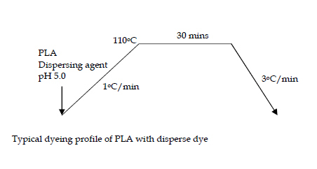 염색온도 산도 3~5, 분산염료, 승온1도/분, 110 도 30분, 냉각 3도/분 심색가능